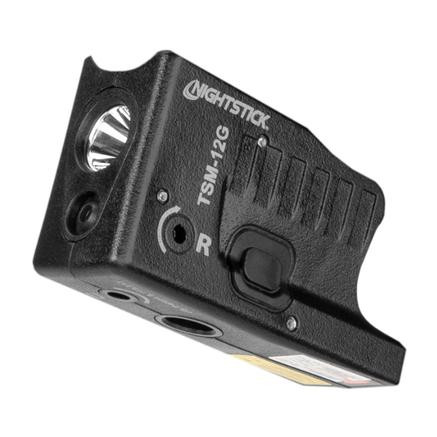 The TSM-12G Subcompact Tactical Weapon-Mounted Light with Green Laser for Glock® G26, G27, and G33 sub-compact pistols uses a super-bright LED rated at 150 lumens working in conjunction with a precision-engineered miniature reflector to create a bright white beam of light rated at 104 meters. This weapon light features completely ambidextrous and intuitive toggle switches on each side of the light to operate the momentary-on and constant-on lighting modes or Class IIIa 532nm daylight-visible green laser. These lighting modes include white light, laser, or both light and laser.